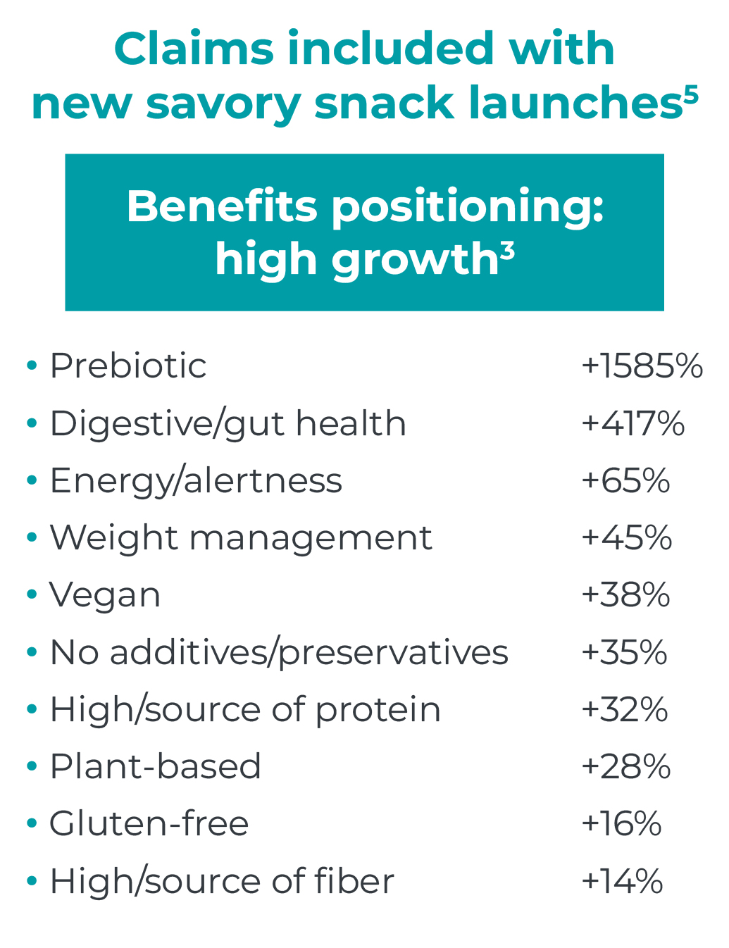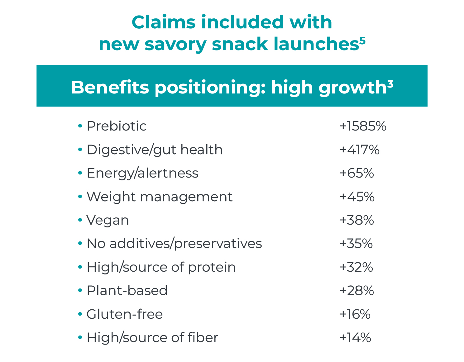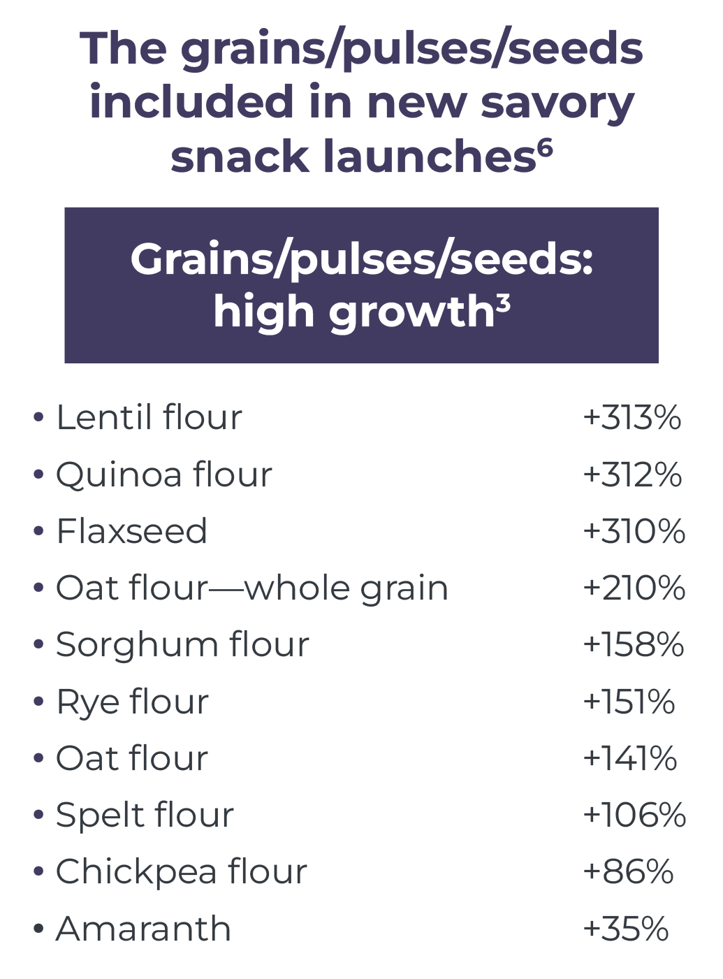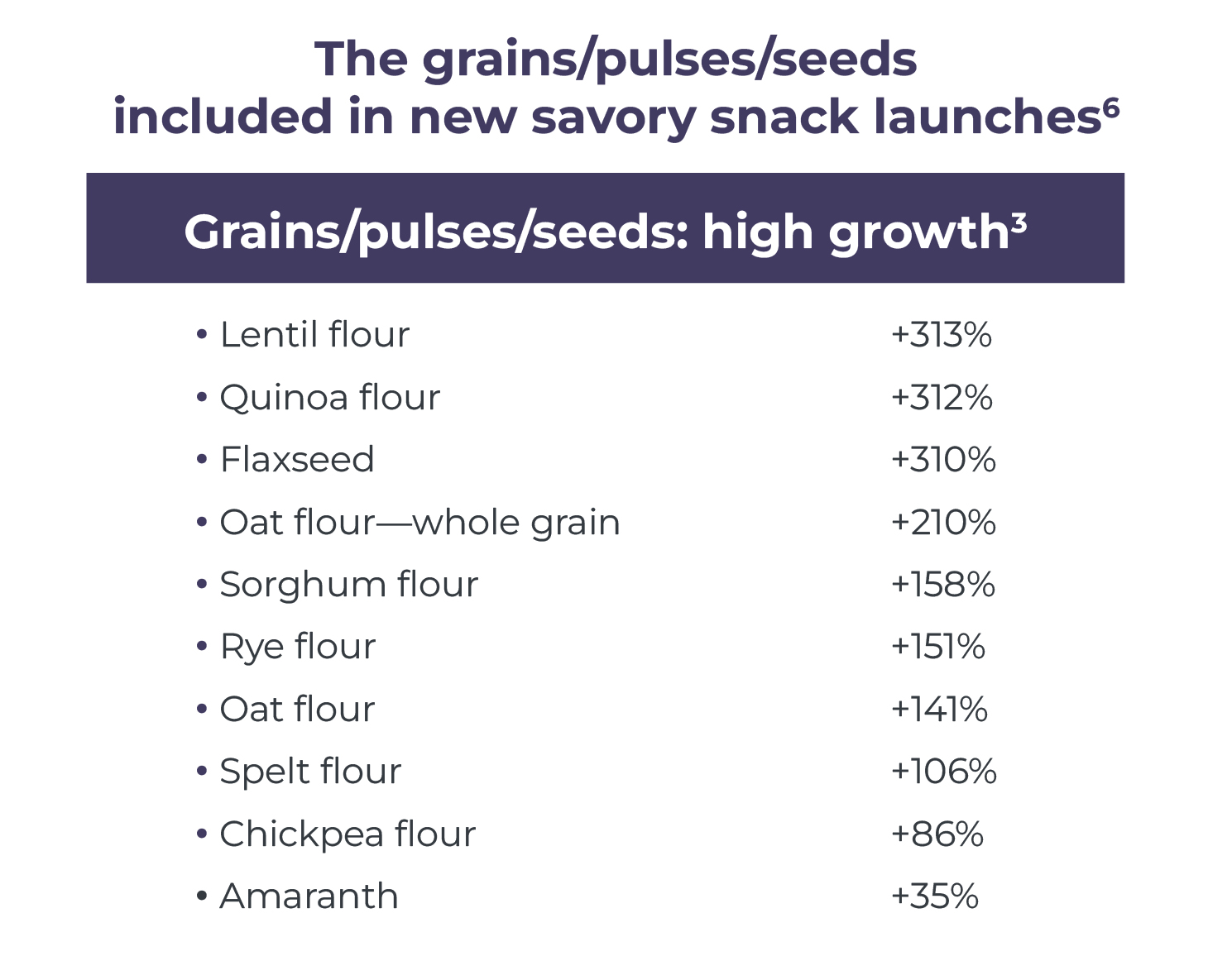5, 6. Innova Market Insights; 1- Savory Snacks includes All Snacks, Crackers that contain Grains, Flours, Pulses 2- results show the share of all Savory Snack product launches between 2021 – 2025 (ytd) that included the respective ingredient, non-exhaustive, some intentional judgment used; 3- results show the share of all new Savory Snack products launches with the respective positioning 2025 (ytd) vs 2024, some intentional judgment used; bolded text indicates the both high share and fast growth